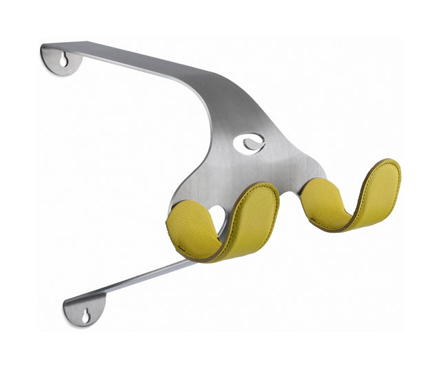 Stainless steel and leather wall mounted bike hanger. Beautifully made from curved stainless steel and detailed with leather contact pads that cushion your top tube or handlebar with reassuring softness. The Cactus Tongue SSL wall mounted single bike holder is an indoor bike hanger that oozes class while at the same time simply solving the problem of indoor bicycle storage.