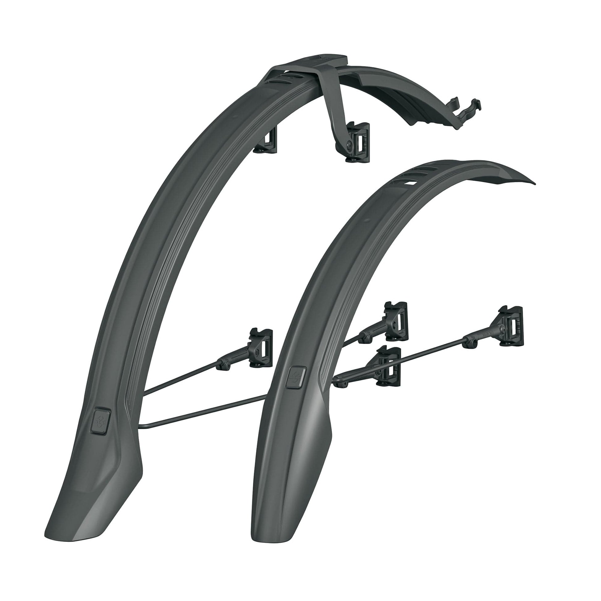 The VELOFLEXX mudguard set combines the stability of a fixed mudguard with the flexibility of a clip-on mudguard. The VELOFLEXX bridge allows the rear mudguard to be mounted at the top of the seat bar without tools, using rubber straps. This mounting solution no longer requires the brake bridge where the brake caliper is usually mounted. At the front, the VELOFLEXX is mounted to the fork bridge with a rubberised hook and loop fastener or a cable tie. The frame adapters enable it to be mounted to any fork. Furthermore the angle of the adapters can be adjusted. The black-coated stays provide even greater support. They are fastened with hook and loop fasteners (front) and rubber straps (rear) without the need for tools. The disassembly is also quick and hassle-free. The VELOFLEXX set is available in three different widths and suitable for fitness bikes, mountain bikes (Cross Country/All Mountain) and city bikes. Hook and loop fasteners and rubber straps are included in the scope of delivery.
